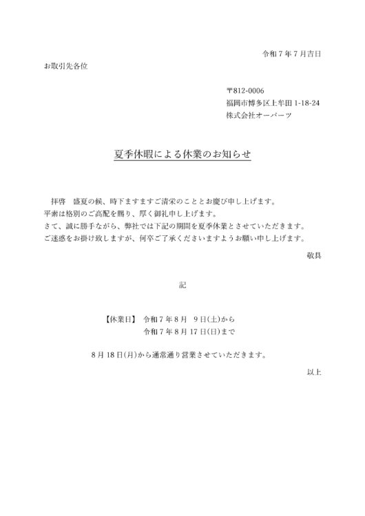 夏季休暇による休業のお知らせ