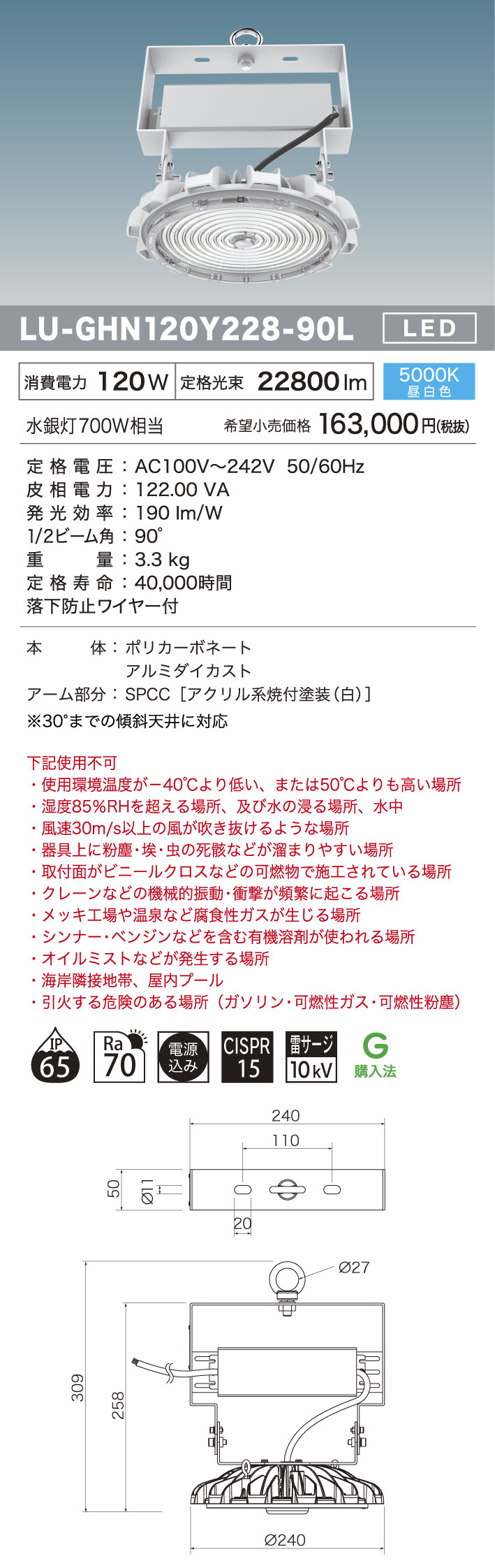 120W型 LED高天井用照明器具 / 昼白色水銀灯700W相当製品概要製品概要