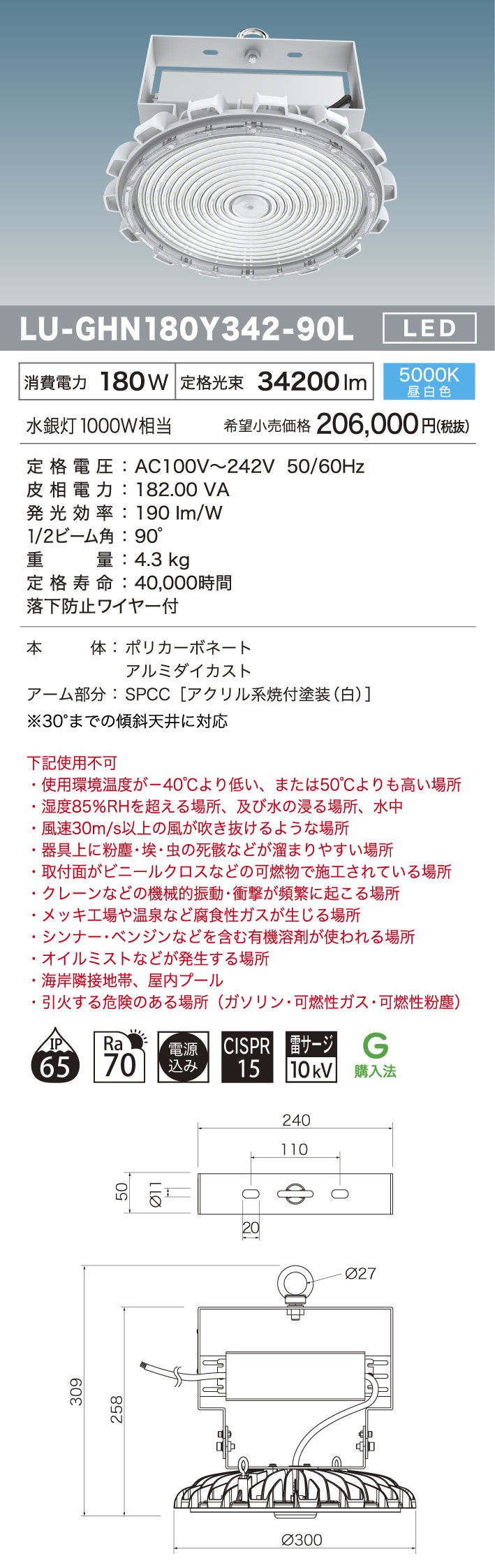 180W型 LED高天井用照明器具 / 昼白色水銀灯1000W相当製品概要製品概要
