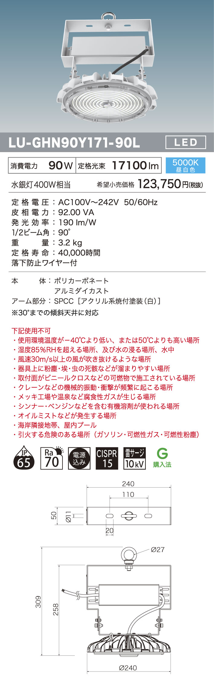 90W型 LED高天井用照明器具 / 昼白色水銀灯400W相当製品概要製品概要